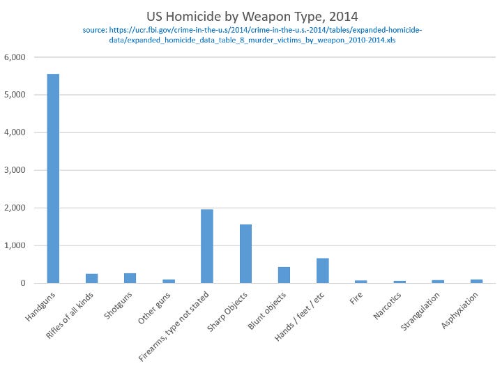 In 2014, homicides by any kind of rifle were only 3% of firearm homicides. They were 2.1% of total homicides, and 0.7% of total gun deaths. And that figure includes every kind of rifle available, not only semi-automatics with detachable box magazines such as the AR-15, but also bolt-action hunting rifles, Ruger 10–22 plinkers, and the whole lot.