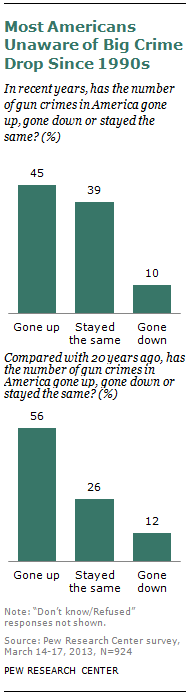 So pick your baseline. The average homicide rate in this country since 1910 is 6.86. Since the turn of this century it’s 5.26. This decade it’s 4.68. What’s the baseline? No matter what baseline you pick, there’s no epidemic. It’s fake. But much of the public certainly thinks there’s an epidemic. The Pew Research Center tracks that. Here’s a graph from a study they did in 2013: