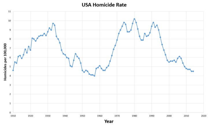 A bit of honesty: I’m implying here that the homicide rates track with drug and alcohol prohibition without supporting the implication. I may try and support that implication with a future article, but there are other possible explanations, such as immigration, economics, or even lead in the water. The lead thing is actually pretty intriguing, although I remain skeptical for now. Tackling the vast array of multivariate homicide drivers is out of scope for this article.
