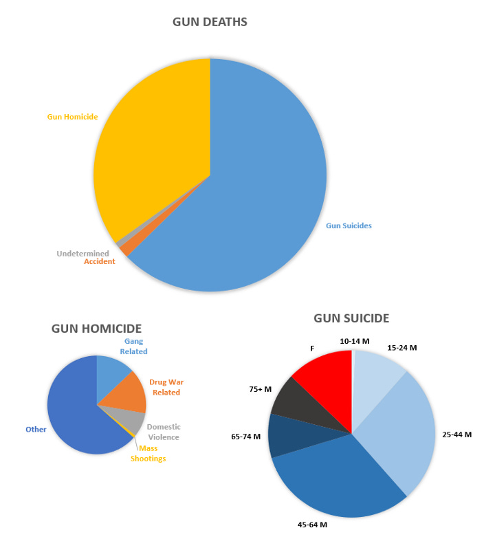 Suicide, which is the dominant figure in the “gun deaths” problem, is covered in the prior article. Now focus on the smallest pie above, which is homicide, and let’s also expand that by demographic.