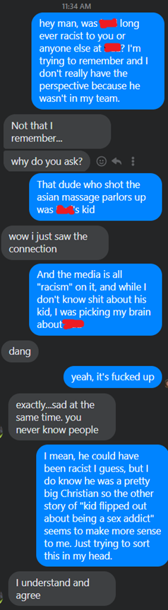 I’m not going to name him here despite his name probably being googlable at this point, but I worked with the shooter’s father, herein “Dad,” for the better part of a decade at an engineering company in Atlanta. It was a diverse workplace, with plenty of women, black folks, and such. My boss was a Jehovah’s Witness and naturalized Eritrean immigrant. “Dad” worked in a different group, but we had lunch regularly. We only ever had one employee in our 40+ member firm who expressed any outward racism, as far as I’m aware, and he was fired over it.