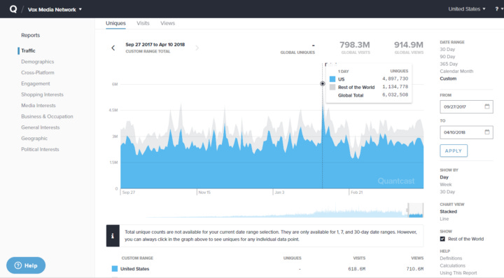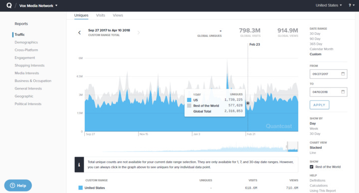 Vox has been kind enough to make their general traffic numbers public, and from that, we can back our way into some of their revenue numbers. In 2016, they got around 4.7 billion views, world-wide, and their gross revenue was around 100 million dollars. That would be two cents per view, which is over ten times what Medium’s paying me. That’s probably not a very reliable way to analyze it, though, because a lot of Vox’s earnings are piped through YouTube as Vox has shifted to video content. It’s all blended and crosslinked.