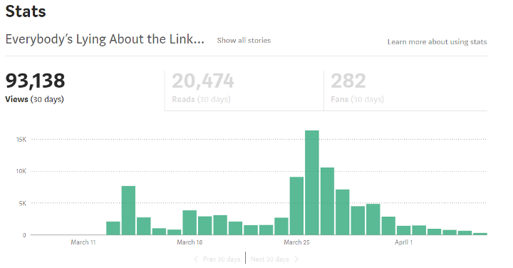The whole article is a good read, but I’m not convinced that anyone is doing it purposefully. I think they’re all doing it, to varying degrees, out of raw necessity, and the whole thing ties back to the evolution of the business model itself. For our case study, let’s use the only numbers I have available, which are mine from Medium.