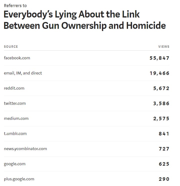 I posted my first gun policy article on Medium on March 13th of this year, mostly so I didn’t have to copy and paste the same argument repeatedly into the wall of culture-war gun threads I was swimming through on Facebook. It gave me an opportunity to really dig deeply into the numbers, and expose the vicious games of data manipulation I kept seeing over and over in the media. Didn’t think it would get big, but I threw it up onto a subreddit to see if anyone else was interested in reading it. Apparently, a few were.