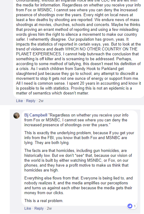 Why else would almost everyone believe in a homicide epidemic that isn’t true? Here’s a snapshot of some social media reaction to one of the articles in the series, screen grabbed from Facebook: