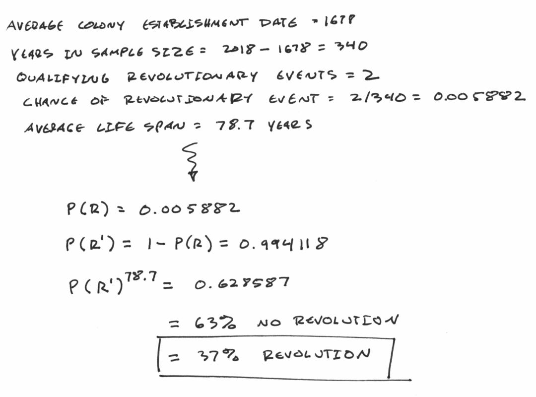 Stepping through this, the average year for colony establishment is 1678, which is 340 years ago. Two qualifying events in 340 years is a 0.5882% annual chance of nationwide violent revolution against the ruling government. Do the same math as we did above with the floodplains, in precisely the same way, and we see a 37% chance that any American of average life expectancy will experience at least one nationwide violent revolution.