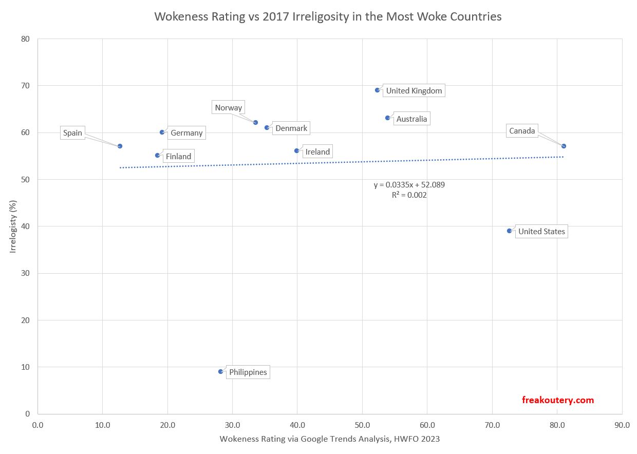 The Philippines is an extreme outlier, and South Africa wasn’t plotted because it wasn’t in the irreligion data set at all, but even if Philippines is removed from the analysis there’s still no relationship. One would expect irreligion and wokeness to positively correlate, and they do not seem to do so. This may speak to the haphazard methodology herein, or to this analysis specific focus on the leaders of the wokeness pack, or to a fundamental flaw in HWFO wokeness analysis.