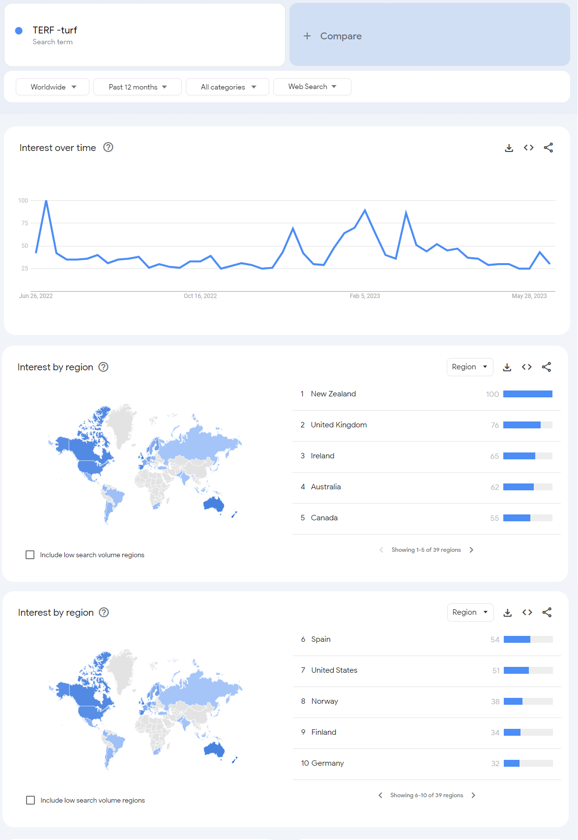 This methodology biases towards English speaking countries because the search terms are English. It also biases towards specific phrases, so studying a cluster of different phrases would yield different yet probably similar results. An interested reader could fairly easily carve off the time to do a much more detailed analysis, and if one did, then they would need to ensure that their cluster of query terms best reflected the body of woke thought at the time. For instance, querying “37 genders” would probably pull no results today, but it would pull lots of results in 2016 back when the woke thought 37 was a magic gender number. Stacking the spreadsheet with a lot of transgender related terminology would bias the rankings towards England and TERF hotbeds.