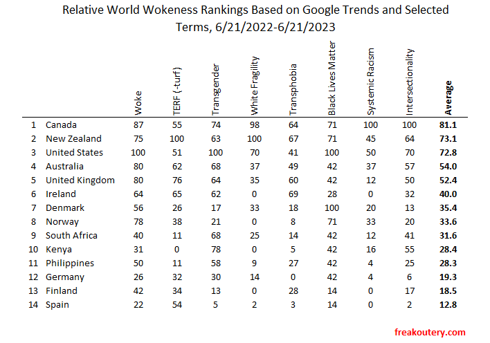 New Zealand was a surprise to me. They’re slightly under average in Systemic Racism searches, but solidly in the top two or three on almost every other term, and pull a 100% on the most charged ones in the list, of TERF and White Fragility. This seems to indicate to me that the New Zealand woke culture warriors are some of the most forceful and provocative.