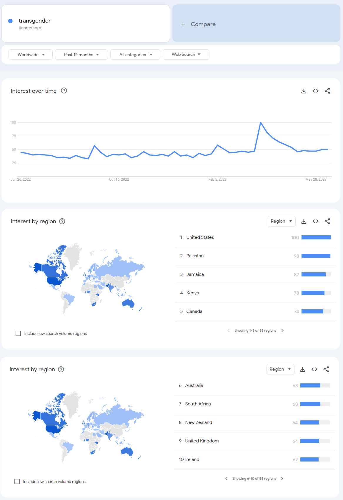 So for instance in the above list, the USA queries the term “transgender” more than any other country on a “per capita” basis, and that “per capita” query number becomes the default against which all other countries “per capita” numbers are compared. People in the United Kingdom query the term “transgender” 64% as often as people in the USA do, compared to the total number of searches from each of those representative regions.