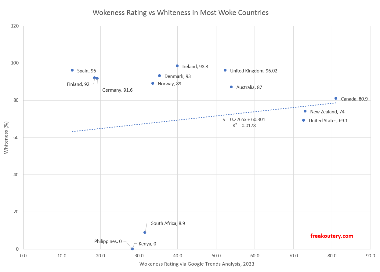 If you go by data at Nationalists.org there’s no apparent bivariate correlation in the most woke countries with their relative fraction of white population either.
