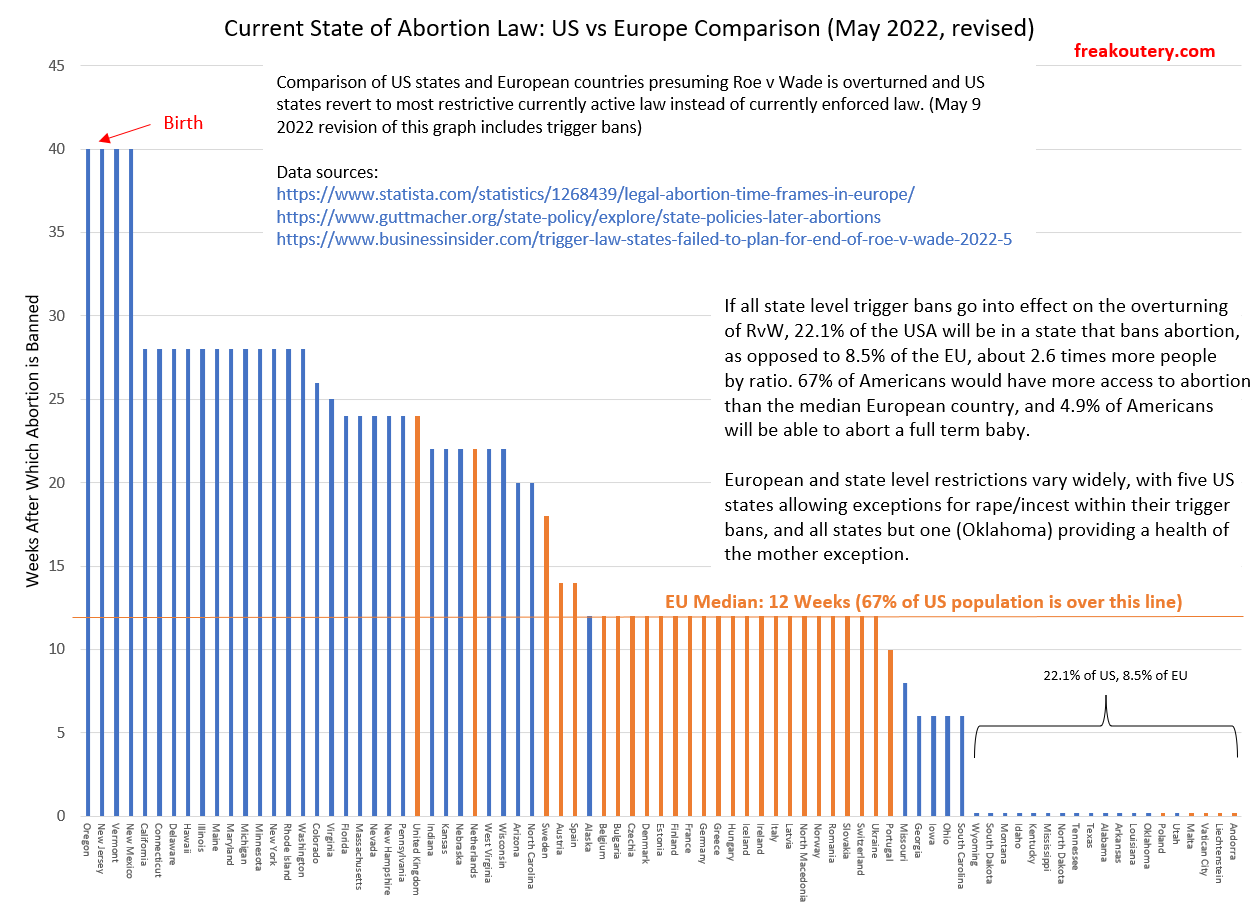 On May 5th 2022 I published a comparison between effective abortion law in the United States should Roe v Wade be overturned and the current state of European abortion law. The article showed that if Roe v Wade goes away, the state of abortion law in the United States would end up being vaguely similar to that of Europe, with some areas more restrictive and other areas considerably less restrictive. The article was based on this page from the Guttmacher Institute, a pro-choice abortion research organization. Because they are well cited and pro-choice, I presumed they’d have their tables up to date, but it appears they do not. That page indicates some but not all of the “trigger bans” due to go into effect upon an overturning of Roe v Wade. I have revised the statistics and graphs from that article to include all trigger bans as described in this piece of research on Business Insider, and the charts look noticeably different. Behold the new chart.