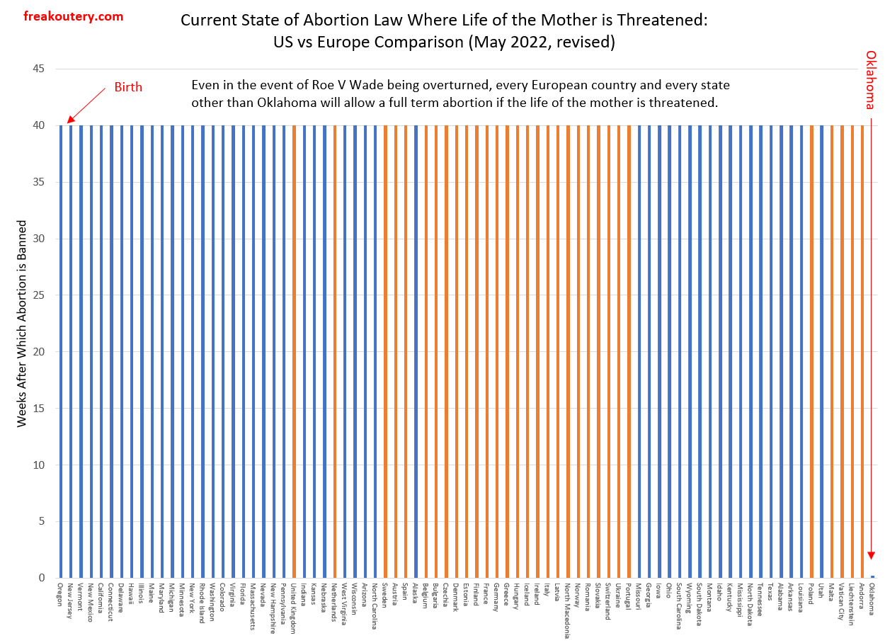This very silly graph drives the point home. Unless you live in Oklahoma, the “life of the mother” talking point is irrelevant and can be entirely ignored. I will be surprised if Oklahoma doesn’t scramble to stick a “life of the mother” exception into their law in the near term, because it’s likely they didn’t consider the consequences of their actions when they passed their law. They passed it to pander for votes.