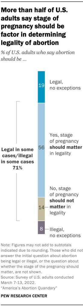 The Pew and Gallup numbers don’t match exactly, but they are both indicative of a general trend. Per Gallup two thirds of Americans support abortion approximately to the median European limit, less than one third support it through the predominant blue state limit of 24 weeks, and only one in eight support it through the limits adopted by Oregon, New Jersey, Vermont, and New Mexico.