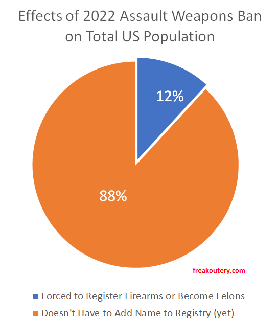 Next, let’s try to visualize the number of people impacted by the proposed ban. Contrary to some early social media posts, the Assault Weapons Ban of 2022 does not create instant felons, but it does require that everyone who owns a banned item register that banned item with the government. Given how tremendously low compliance is with such ex post facto registration requirements, it’s very likely most of these individuals would choose not to register their items. And even if they did, it’s obvious to anyone who’s ever tried to file anything with the ATF that they are incapable of processing this amount of paperwork.
