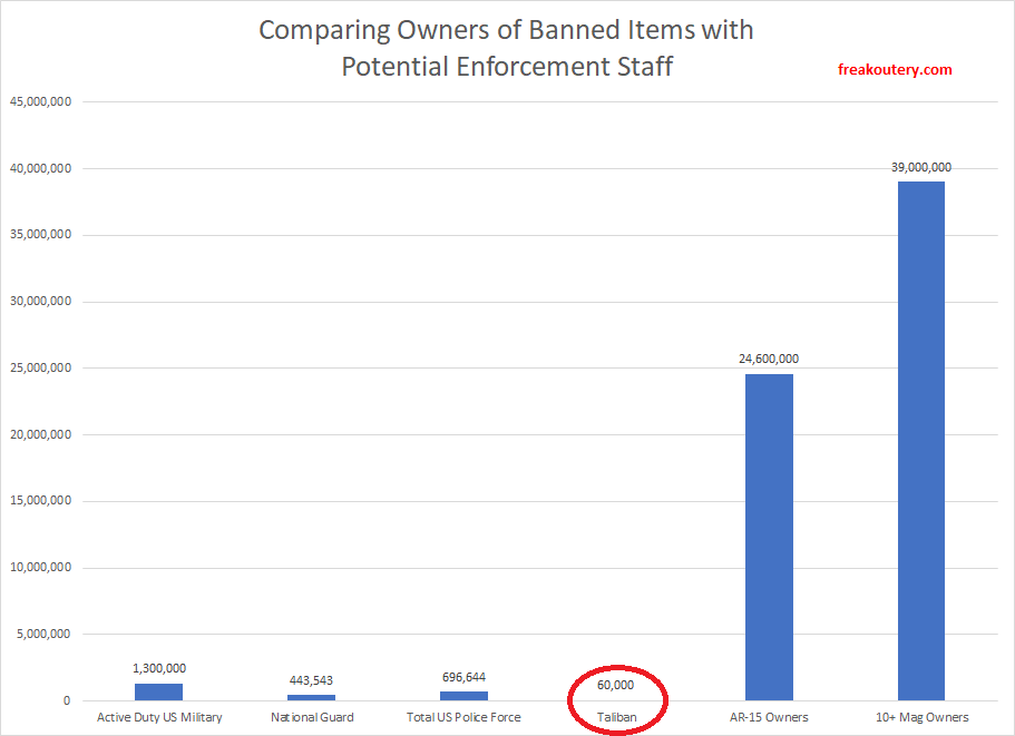 These numbers are very stark. There are 19 times more AR-15 owners than there are staff in the entire active duty United States military. There are 410 times more United States AR-15 owners than the Taliban, to whom that self same military famously lost last year. There are 55 times more AR-15 owners than the entire National Guard. I didn’t put the ATF on the graph, but as of 2019 the ATF had 1,714 field agents, approximately one field agent for every fourteen thousand AR-15 owners.